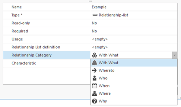 De eigenschappen van het veldtype: Relatielijst zijn uitgebreid met Relatiecategorie. Hierdoor kun je de standaard Relatiecategorie "Met wat" wijzigen in bijvoorbeeld "Wie" of "Waarom ".