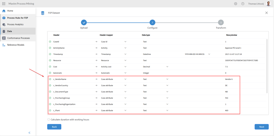 Gebeurtenislogkolommen die beginnen met "c_" worden automatisch toegewezen als Case Attributen bij het configureren van datasets.