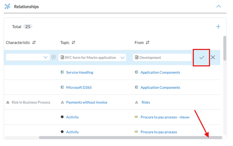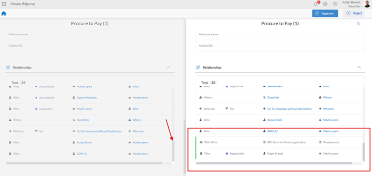 Zodra het onderwerp is ingediend voor goedkeuring, kan de goedkeurder de toegevoegde, gewijzigde of verwijderde relaties zien.