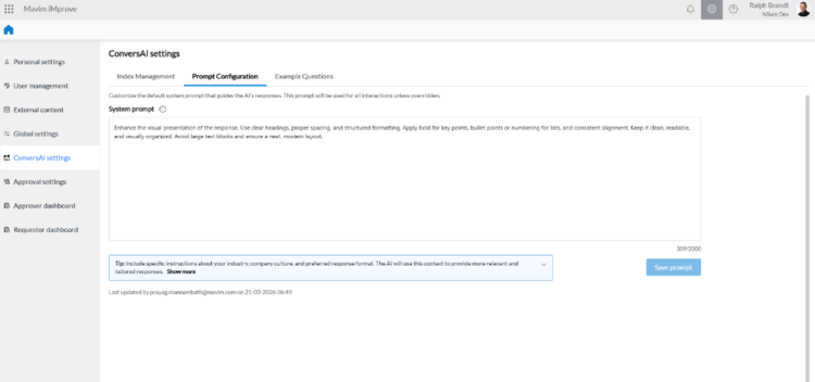 Er is een promptconfiguratie-editor voor ConversAI beschikbaar als preview. Met deze functie kunnen gebruikers de prompt aanpassen, zodat de antwoorden van ConversAI beter aansluiten bij hun bedrijfscontext en inhoud.