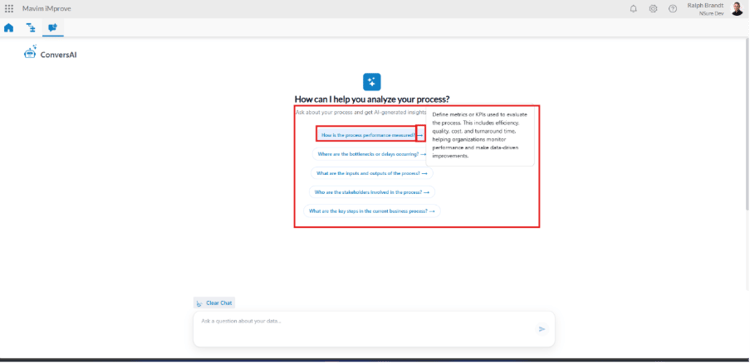 Gebruikers zien de voorbeeldvragen in ConversAI. Als de gebruiker op een vraag klikt, wordt deze naar het chatvenster gekopieerd en kan de tekst nog worden aangepast voordat deze naar ConversAI wordt verzonden. Wanneer op de pijl wordt geklikt, wordt de vraag direct verstuurd naar de chatbot.