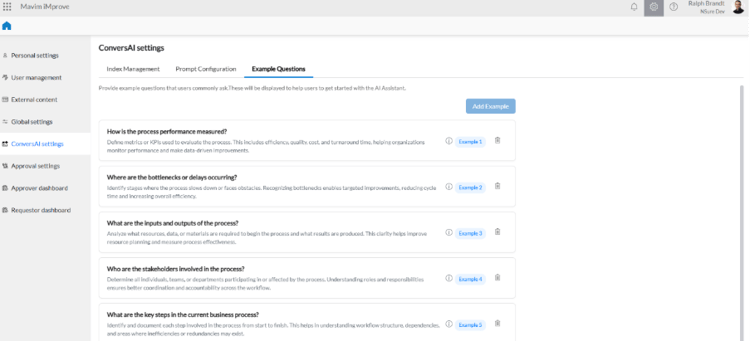 Beheerders kunnen voorbeeldvragen instellen in de ConversAI-instellingen.