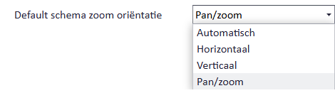 • De optie pan/zoom is toegevoegd aan de mogelijke selecties bij Default schema zoom oriëntatie. Deze optie werkt het beste bij schema's, waarbij de breedte groter is dan de hoogte. Je vindt deze optie op de Admin pagina, in de Algemeen tab.