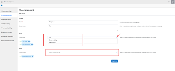 - When editing groups, it’s now clearer how to search and select roles or users. Just type what you’re looking for or click the arrow to open the dropdown for quick selection.