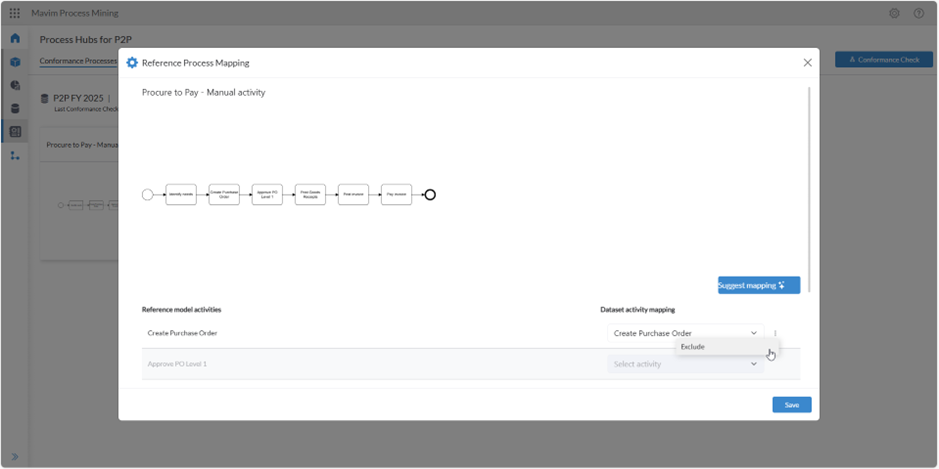 With a click of a button our AI functionality will automatically detect the dataset activity names and map these to the reference model activity names. For example, the activity Create PO is automapped to the the reference activity Create Purchase Order. This saves significant time for a user. When it does not find a match, the mapped activity remains empty.