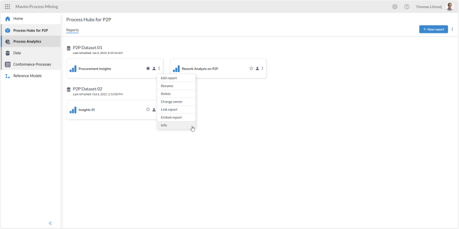 Reports are categorized in the Process Analytics overview. Reports are used to visualize process insights based upon the dataset. The reports are clustered underneath their linked dataset.New | Report template