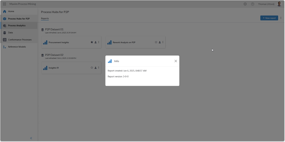 - On the Dataset and Report a ‘Info’ button is available to show the version and the creation date of the respective report or dataset. This will provide the user with more information on their dataset compatibility, as Mavim releases new versions of the dataset and report over time.