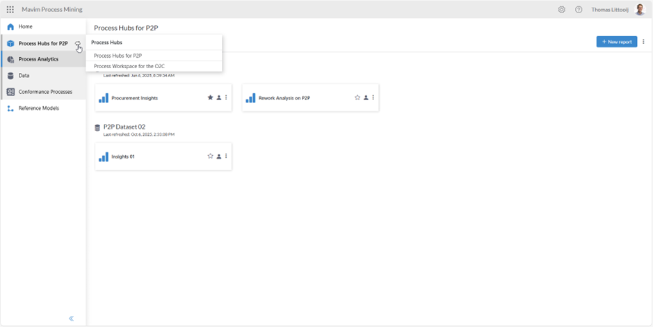 A new look and feel with more intuitive functionalities are implemented in the new user interface of the product. Mavim Process Mining is fully integrated with Mavim Connect Center for centralized access management.Process Hubs are used as a centralized hub for process analysis on a process or process domain (e.g. Order to Cash and Procure to Pay). Process Hubs are created for user to collaborate on process mining analyses with creating datasets and process mining reports. Users are assigned to one more Process Hubs to segregate access to data.