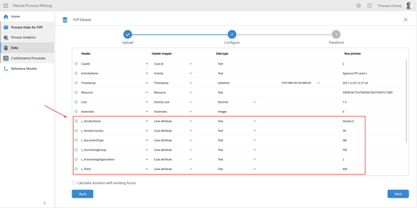 - Automatically map columns in your event log that start with “c_” as a Case Attribute when configuring a new or exisiting dataset.